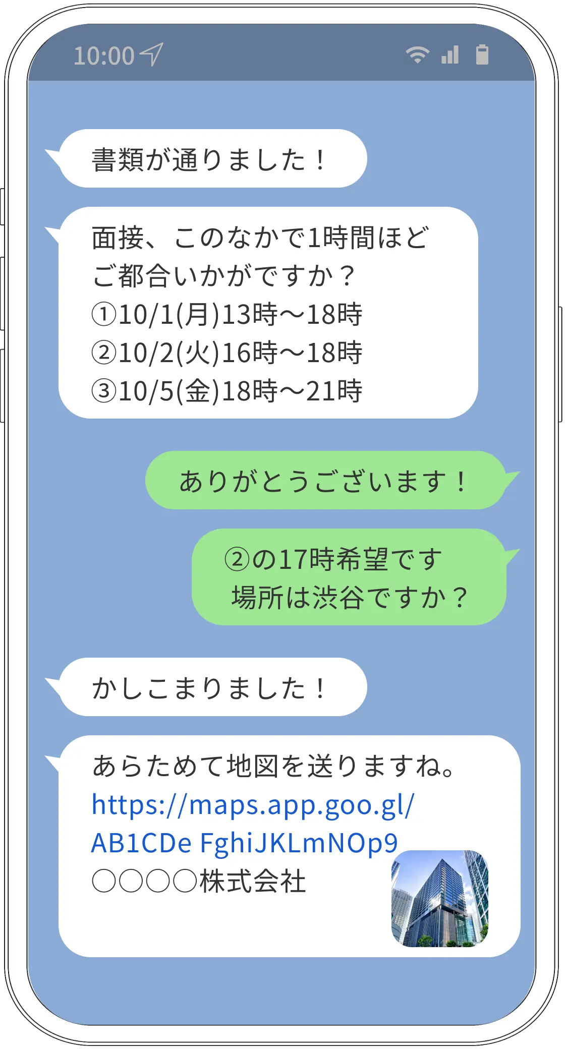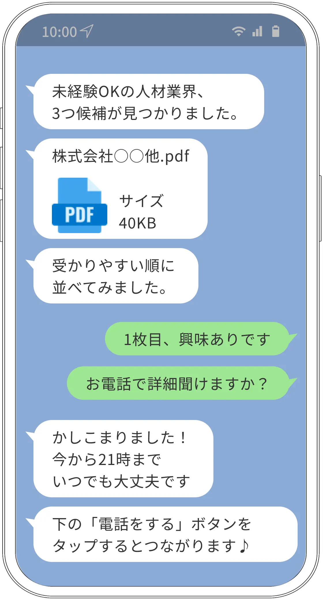 気に入る求人が見つかったらLINEで履歴書作成&送信。面接日時の設定など企業のやりとりは全てお任せください。